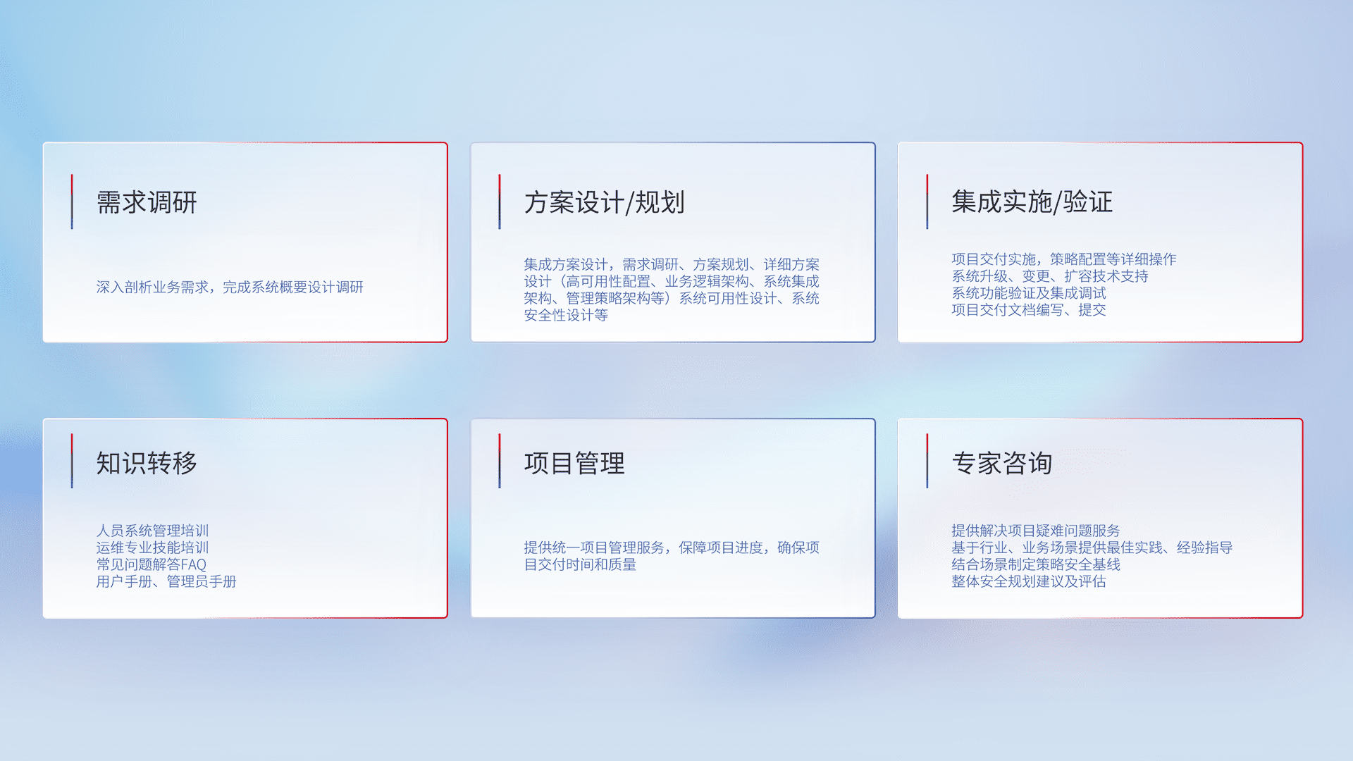 针对客户行业特性,,将宏观的安全战略和需求,,通过专业的交付服务,,,实现项目落地,,,为客户提供标准规范的集成交付服务。。。。